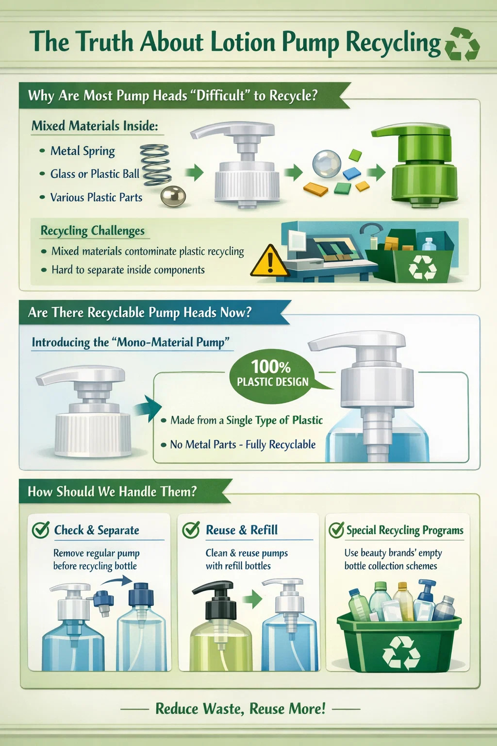Potíže s recyklací: Recyklační stroje obvykle dokážou zpracovat pouze jeden materiál. Když tato čerpadla, která jsou směsí kovu a plastu, vstoupí do recyklační linky, stroje mají potíže s jejich oddělením. Pokud nejsou odděleny, kovová pružina „kontaminuje“ velkou dávku čistého plastu a může dokonce poškodit recyklační zařízení.