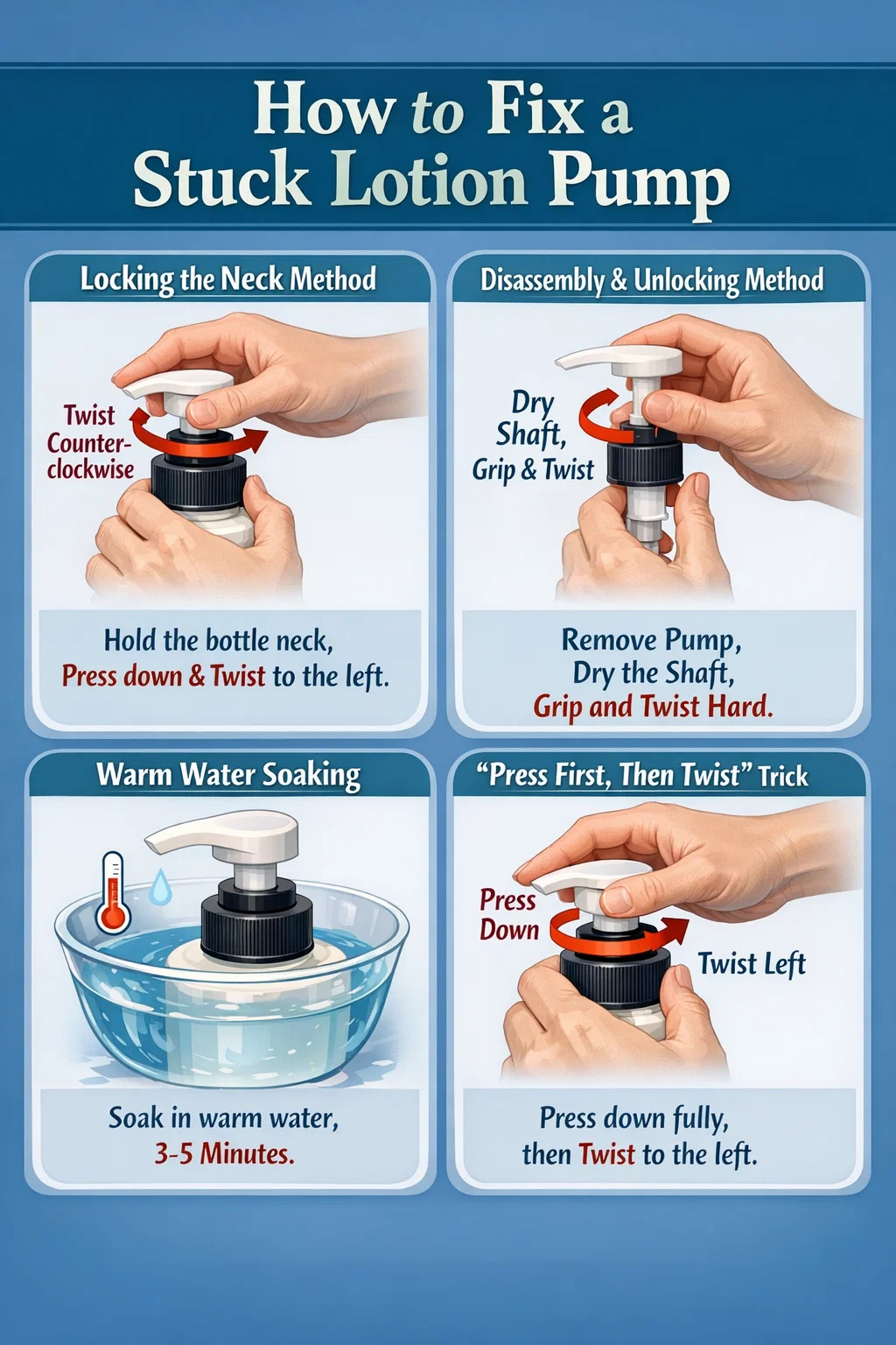 Je to docela frustrující, když si nově koupíte pumpička na pleťovou vodu nevyskočí bez ohledu na to, jak moc s ním otočíte. Je to obvykle proto, že vnitřní uzamykací mechanismus je příliš těsný nebo s ním neotáčíte správným způsobem.