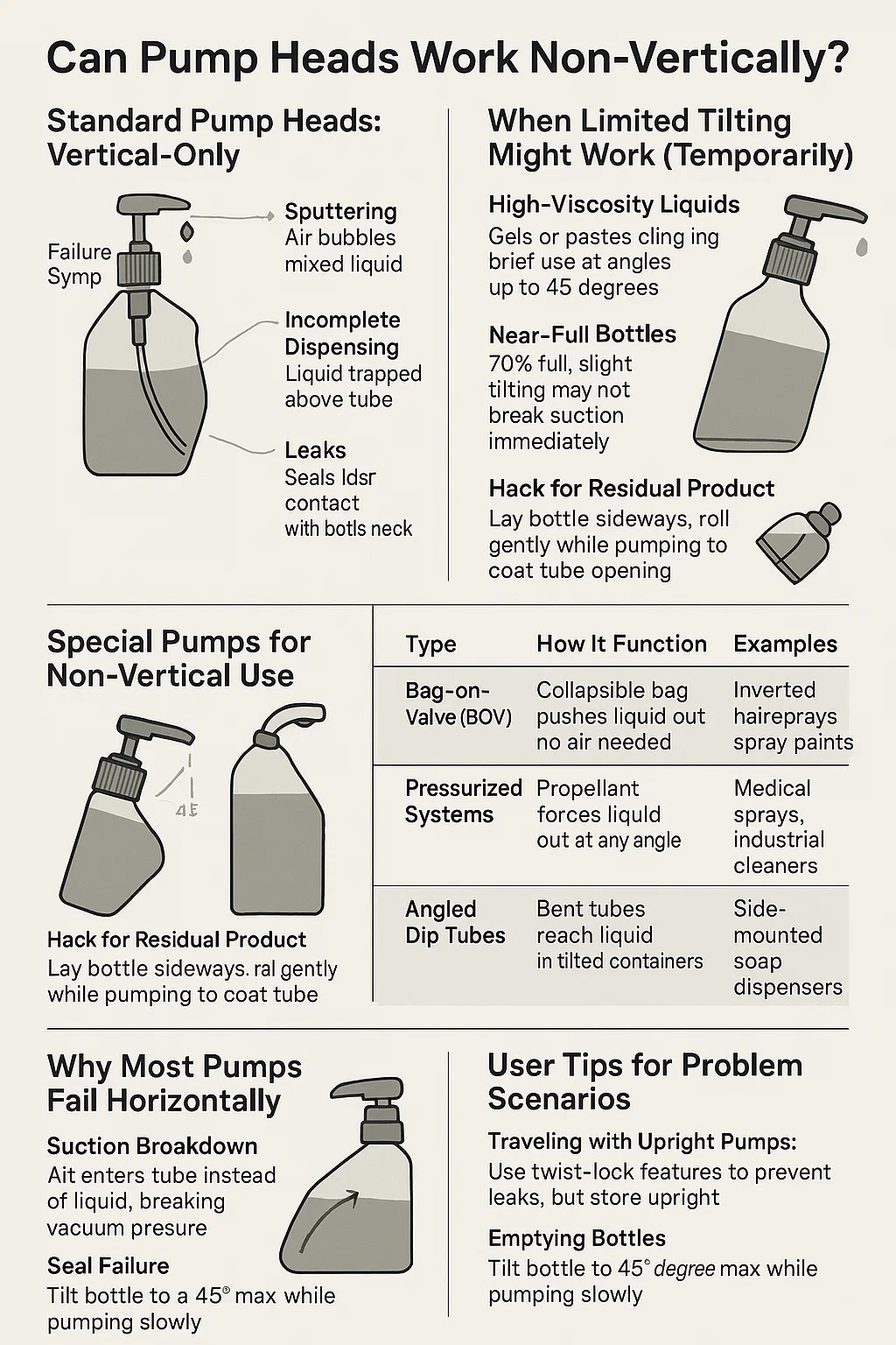 Selhání těsnění: Odsek čerpadla se spoléhají na gravitaci, aby udržovali kontakt s lahví.