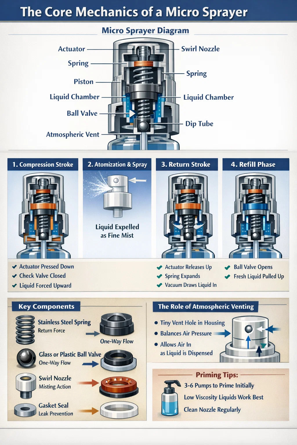Základní princip fungování mikrorozprašovače je založena na vytěsňování kapaliny a atmosférického tlaku, konkrétně s využitím a mechanismus objemového čerpadla . Když je ovladač stlačen, stlačí pružinu a zmenší objem uvnitř malé komory, čímž vytlačí kapalinu přes přesnou trysku. Po uvolnění pružina stáhne píst zpět a vytvoří a vakuum která nasává čerstvou tekutinu z láhve skrz ponornou trubici, aby se naplnila komora pro další sprej.